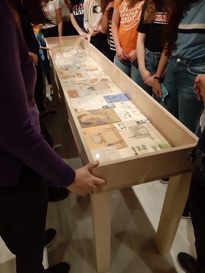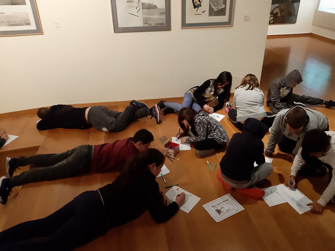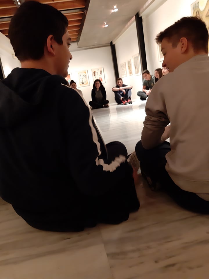 Συζητήσαμε με 25 και 26 μαθητές της Γ΄ Γυμνασίου αντίστοιχα, του Γυμνασίου Νέας Κυδωνίας Χανίων, για τα όνειρα και τους εφιάλτες μας και προσπαθήσαμε να εντοπίσουμε τα όνειρα και τους εφιάλτες του καλλιτέχνη, μέσα από μία βιωματική περιήγηση στο έργο, αξιοποιώντας τον διάλογο και τη συνεργασία.