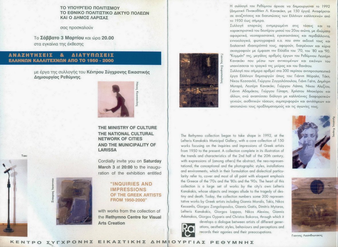 H έκθεση με έργα από τη Μόνιμη Συλλογή του Μουσείου Σύγχρονης Τέχνης Κρήτης με τίτλο: “Αναζητήσεις – Διατυπώσεις Ελλήνων Καλλιτεχνών 1950 – 2000”, παρουσιάστηκε στο Εικαστικό Κέντρο Σύγχρονης Τέχνης Λάρισας από τις 8 Μαρτίου έως τις 28 Απριλίου 2001.