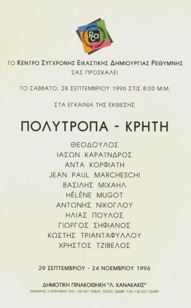 Το Κέντρο Σύγχρονης Εικαστικής Δημιουργίας Ρεθύμνης (σημερινό Μουσείο Σύγχρονης Τέχνης Κρήτης), οργάνωσε στη Πινακοθήκη «Λ. Κανακάκις», από 29 Σεπτεμβρίου έως 24 Νοεμβρίου 1996, την έκθεση ΠΟΛΥΤΡΟΠΑ – ΚΡΗΤΗ, που επιμελήθηκε η τεχνοκριτικός και ιστορικός τέχνης Βάσια Καρκαγιάννη-Καραμπελιά.