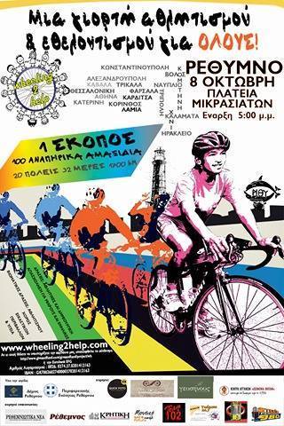 Το “Wheeling2Help” είναι μία μη κερδοσκοπική οργάνωση που λειτουργεί υπό την αιγίδα της Ελληνικής Παραολυμπιακής Επιτροπής και σκοπός της είναι, παράλληλα με την διεξαγωγή ποδηλατοδρομίας που θα διασχίσει 20 ελληνικές πόλεις -από την Κωνσταντινούπολη ως το Ηράκλειο- σε 32 ημέρες και 1,700 χλμ. με ένα μοναδικό σκοπό: να διαδώσει ένα μήνυμα αγάπης και αλληλεγγύης για τα παιδιά με αναπηρία. Μέσα από την συγκεκριμένη δράση συλλέγει χρήματα με σκοπό την αγορά 5 αναπηρικών αμαξιδίων ανά πόλη μέσω της διαδικτυακής πλατφόρμας www.giveandfund.com/giveandfund/project/wh.