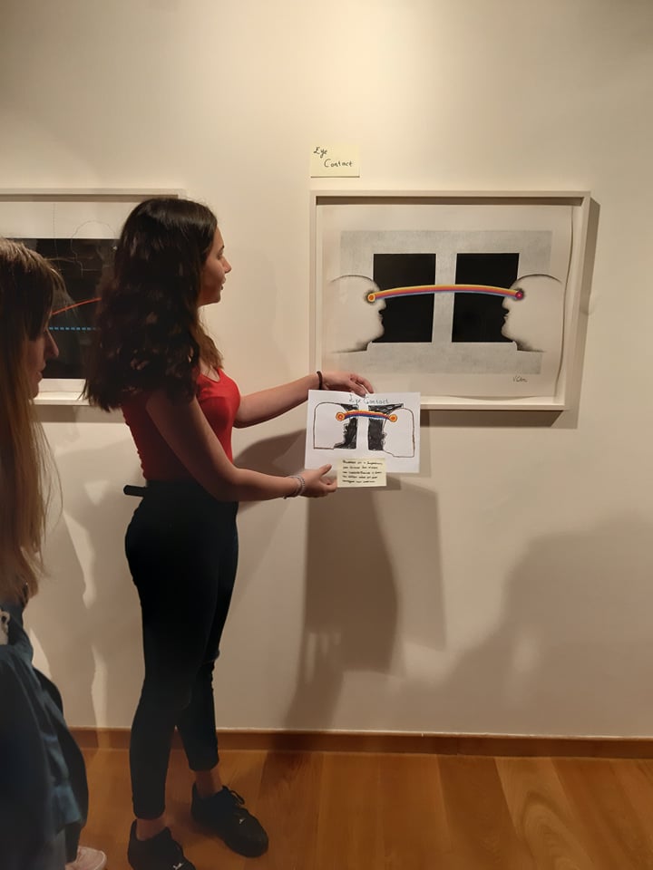 Συζητήσαμε με 25 και 26 μαθητές της Γ΄ Γυμνασίου αντίστοιχα, του Γυμνασίου Νέας Κυδωνίας Χανίων, για τα όνειρα και τους εφιάλτες μας και προσπαθήσαμε να εντοπίσουμε τα όνειρα και τους εφιάλτες του καλλιτέχνη, μέσα από μία βιωματική περιήγηση στο έργο, αξιοποιώντας τον διάλογο και τη συνεργασία.