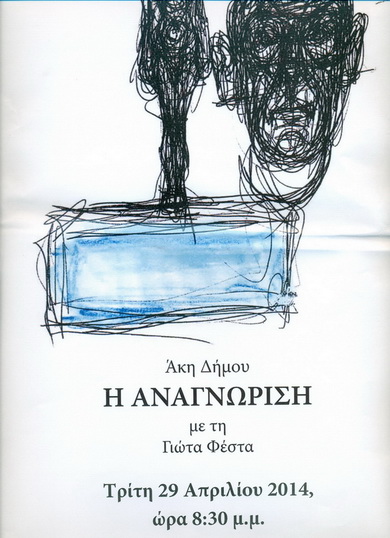 Το έργο του Άκη Δήμου "Η Αναγνώριση" ερμήνευσε και σκηνοθέτησε η Γιώτα Φέστα. Η Γιώτα Φέστα, αυτο-σκηνοθετούμενη και μόνη επί σκηνής διηγήθηκε μια «μικρή», μεγάλη ερωτική ιστορία. Παρουσίασε μια ιστορία σαν αυτές που έχουν λείψει πια από τη ζωή μας, μια ιστορία σαν αυτές που «περνούν πάνω απ' τις ζωές και τις σαρώνουν, τις αφήνουν γυμνές και έρημες». Μια μοναχική κατάδυση στον βυθό ενός άδοξου έρωτα, μια σκηνική εξομολόγηση χωρίς παραλήπτη. Η παράσταση περιελάμβανε και κείμενα από την "Αυτοβιογραφία" και "Τα πράσινα μάτια" της Μαργκερίτ Ντυράς.