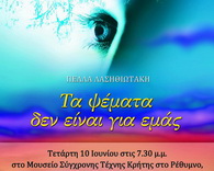 Την Τετάρτη, 10 Ιουνίου 2015, στις 7:30 μ.μ., στους χώρους του Μουσείου Σύγχρονης Τέχνης Κρήτης πραγματοποιήθηκε η παρουσίαση του βιβλίου της Πέλλας Λασηθιωτάκης με τίτλο: Τα ψέματα δεν είναι για εμάς.